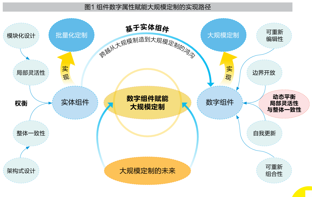 近年来,随着数字技术的迅猛发展与广泛应用,出现了数字化形态的组件,这为大规模定制带来了新的可能性。数字组件通常以应用程序、媒体内容等虚拟人工制品的形式嵌入实体产品或服务中,为使用者提供特定的功能或价值。数字组件不仅有传统组件“功能独立”“相互依赖”等特征,还有“边界开放”“自我更新”等数字化新特性。一方面,由于数字组件的二进制表述方式,其物理形式的限制被大大削弱,组件以流动变化的准物体形式存在于各类场景中,能够被不同的用户或系统访问、调用。另一方面,数字组件天生就是未完成的,始终处于制造和更新的过程中,功能可以持续更新和不断扩展,无需时常更换硬件。因此,具备可重新编辑性与可重新组合性的数字组件能够动态平衡局部灵活性与整体一致性,有效化解二者之间的冲突,赋能企业实现大规模定制。