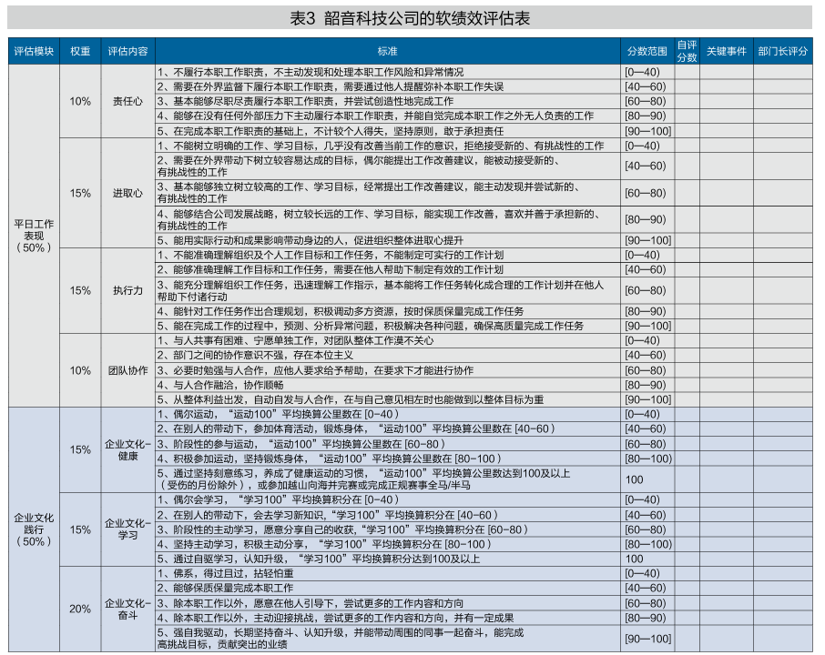 从表3可以看到,韶音科技的软绩效(即态度和自我要求)包括两大块:工作表现(50%)和企业文化践行(50%)。工作表现进一步细分为四个维度:责任心(10%)、进取心(15%)、执行力(15%)和团队协作(10%)。企业文化践行进一步细分为三个维度:健康(15%)、学习(15%)和奋斗(20%)。韶音科技对各个细分维度给出了等级式的打分标准。例如,将责任心分出五档行为表现,最低得分一档对应的行为表现是 “不履行本职工作职责,不主动发现和处理本职工作风险和异常情况”。最高得分一档对应的行为表现是 “在完成本职工作职责的基础上,不计较个人得失,坚持原则,敢于承担责任”。韶音科技的价值观是健康、学习、奋斗、创新,公司认为创新不适合考核,因此考核表中只包括了健康、学习和奋斗三项价值观。针对健康和学习,韶音科技在公司推行“学习100”“运动100”的“双百计划”,最核心的内容是平均每个月完成100个学习积分,运动量达到跑步100公里或同等强度。公司的学习积分和运动积分计算方式有细则,员工可以根据自己的情况,选择适合自己的学习输出和运动方式。例如,一篇学习笔记是10个积分,一次部门内高质量分享是15或者20积分(根据分享的主题是一般的知识类还是专业类来定),一次全公司的课程开发或者高质量的分享是20或者25积分(区分标准同上)。