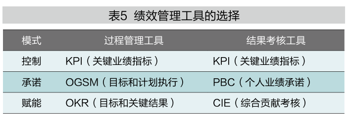 表5总结了适用于不同绩效管理模式的绩效管理工具。如前所述,绩效管理模式通常包括控制、承诺和赋能三种类型。采用控制型绩效管理模式时,建议对结果输出使用KPI进行考核;对过程也使用KPI进行管理。采用承诺型绩效管理模式时,建议使用OGSM进行过程管理;对结果输出的评估,可以根据实际情况使用KPI或PBC。OGSM是指目标和执行(Objectives、Goals、Strategies and Measures,目的、目标、策略和测量),它和OKR最大的不同是,OKR只聚焦于目标和关键成果,而OGSM不仅制定目标和结果指标,还要求制定出实现目标的具体策略和执行计划。相比OKR,OGSM体现出更强的从上至下的控制,但与KPI相比,控制性又有所减弱。PBC是指个人业绩承诺(Personal Business Commitment),PBC相较于KPI的最大特点在于,它允许上下级之间就绩效指标进行协商,体现出一定程度的灵活性和员工参与感。当采用赋能型绩效管理模式时,建议过程管理使用OKR;结果输出的评估工具可以根据管理对象灵活选择。通常情况下,当被考核对象是实体单位(如事业部、部门、项目团队等)时,可根据情况选择KPI或PBC;当被考核对象是个人时,可根据情况选择PBC或CIE。CIE(Comprehensive Impact Evaluation)是一种关注员工综合贡献的绩效考核方式,类似于韶音科技公司的软绩效考核,强调对员工在非量化成果、协作影响、创新贡献等方面的整体评价。