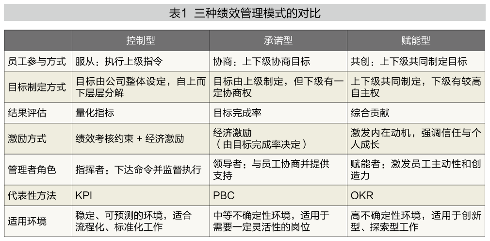 本文把绩效管理模式分成三种基本类型:控制型、承诺型和赋能型。从权力的角度来说,这三种类型的绩效管理模式分别对应服从、协商和共创三种权力关系。服从意味着下级需要接受并执行上级指令;协商是指上级会在一定程度上听取下级的意见,让下级参与决策;共创是指上下级相对平等地共同参与决策,相较于协商,下级有更多自主权。三种绩效管理模式本身没有优劣之分,选择何种模式取决于组织面临的环境不确定程度。不确定性程度越高,越适合采取赋能型模式,反之则适合采取控制型模式。三种绩效管理模式的对比如表1所示。