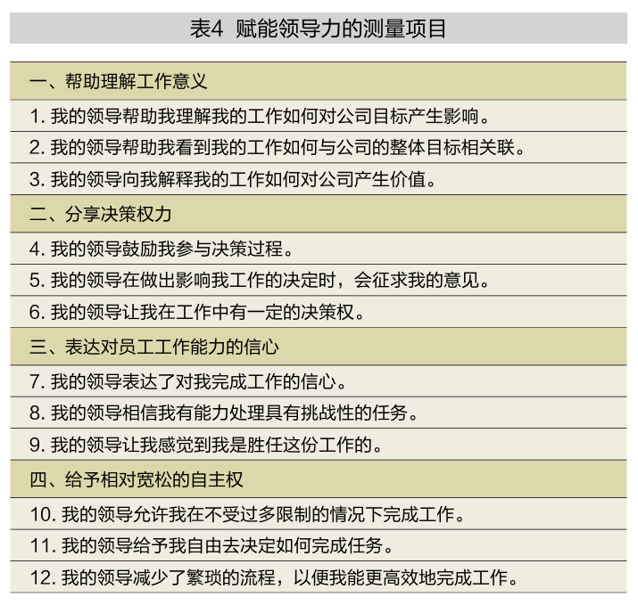 学术界对赋能领导力已经有了比较充分的研究。表4列出了阿赫恩等人开发的赋能领导力量表内容,读者可通过这些具体的行为表述,直观地了解赋能领导力的内涵。该量表包括四个维度:帮助理解工作意义、分享决策权力、表达对员工工作能力的信心、给予相对宽松的自主权。这个量表是从下级的角度来评估上级的赋能领导力,但管理人员也可以对照这些条目进行自评,判断自己在和下属互动时,在多大程度上符合相应的要求。如果整体得分较低,表示领导者对赋能领导力的有效性的认同较低,或者不具备这些领导行为特点。在这种情况下,在团队中实施高赋能绩效管理模式的效果可能不理想。