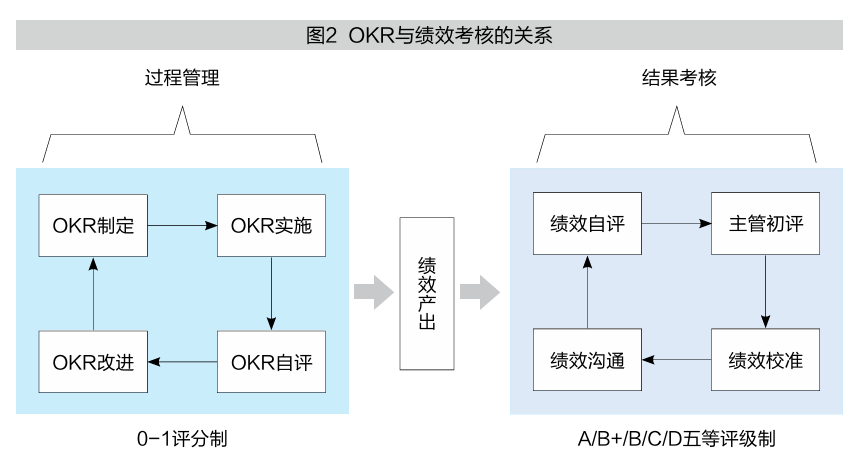 OKR是过程管理工具而非结果考核工具,即OKR把目标过程管理与绩效考核解耦。华为实施OKR绩效管理模式时体现了这一关键特性。图2呈现了OKR与绩效考核之间的关系。OKR的主要目的并不是对某个团队或员工的短期表现进行考核,而是提醒每个人当前的目标是什么、做到了什么程度,使其在工作的时候不跑偏、不失焦。企业和团队需定期评估OKR目标达成率,但评估结果仅用于呈现目标进度,不用于考核。具体而言,OKR评估体系一般采用0—1评分制来评估目标达成率,0分代表无进展,1分代表完全达成。由于OKR体系中的目标通常具有挑战性,因此即使最终得分未满1分,这一结果也有价值。正常情况下,挑战性目标的评分应该为0.6或0.7分,如果员工的个人目标得分都是1分,反而说明目标设定得太简单,缺乏挑战性。