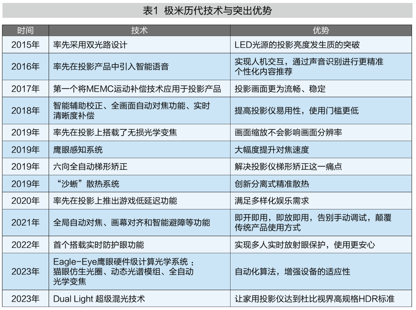 截至2022年1月,极米收获国际大奖共43项,包括红点奖、iF奖、Good Design Award、IDEA奖、CES最佳创新奖等国际知名奖项,并实现了世界四大工业设计奖大满贯。凭借自主创新获得专业技术(见表1),极米逐步构建起了差异化、领先性的产品矩阵,推动智能投影进入千家万户,成为智能投影领域的领头羊。