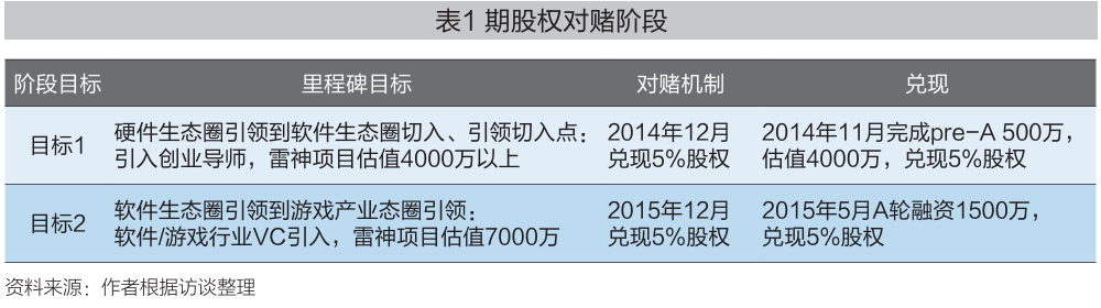 相比股权激励,路凯林更在乎的是决策权,没有决策权,团队做任何事情都束手束脚,很难跟上瞬息万变的互联网时代。主管战略的贾中升提出,雷神团队可以同时拥有用人权、财务权、决策权,前提是团队与海尔签订对赌协议,如果团队在规定期限内实现对赌协议约定的目标,还可以获得创业期股权。基于对雷神品牌和游戏本市场的分析评估,海尔和雷神共同设定了不同阶段的目标,进行阶段性对赌(见表1)。在对赌期股权机制中,雷神的目标是成为互联网游戏产业第一品牌,海尔小微创业平台负责推动雷神引入一流资源和战略投资,最大程度实现品牌市场化。