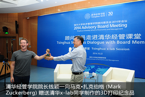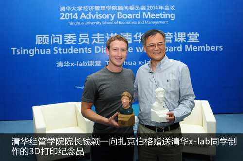 活动最后,钱颖一院长代表清华经管学院向扎克伯格赠送了纪念品,一个由清华x-lab在培创业团队制作的3D打印机打印出的他的头像。扎克伯格还与清华x-lab首届“校长杯”创新挑战赛的十强团队一起合影留念。整场活动在热烈兴奋的气氛中结束。